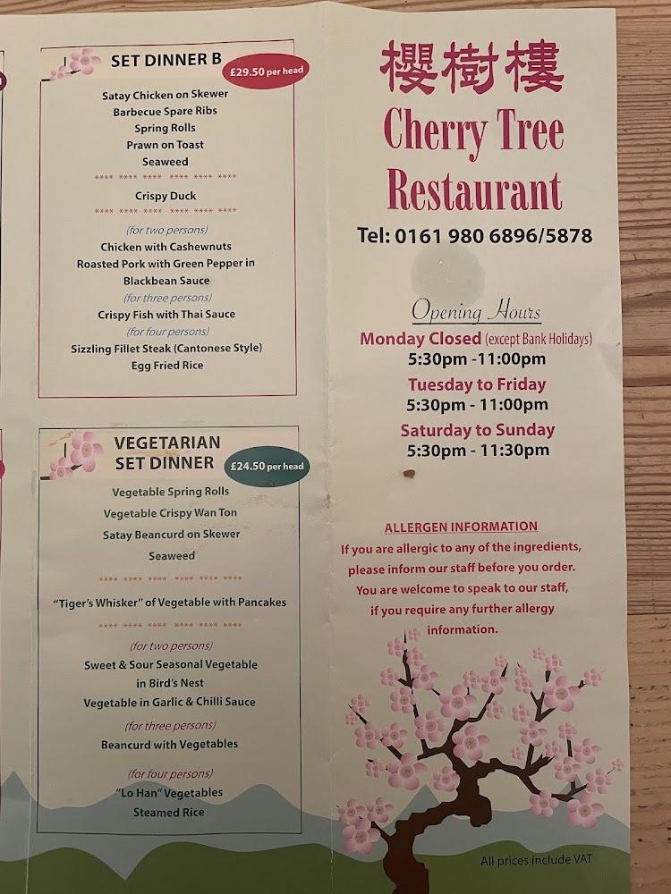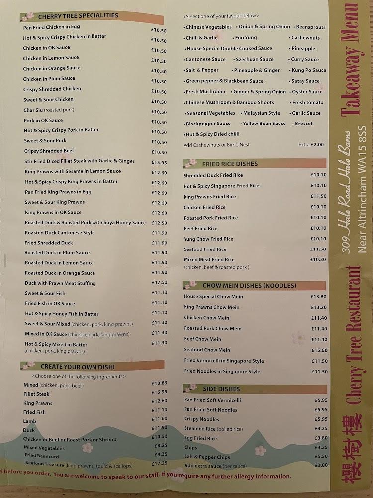 Nestled in Hale Barns, Cherry Tree stands out with its charming décor and warm ambiance. This neighborhood restaurant caters to both dine-in and takeaway options, ensuring convenience and comfort for every visitor. With easy access from the busy streets of Altrincham, it welcomes both casual diners and families. The laid-back vibe adds to the experience, allowing groups to gather and catch up over fantastic food. With diverse menu offerings and a friendly staff, Cherry Tree fosters a welcoming environment that attracts repeat customers. As a point of interest in the area, it’s not uncommon to find birthday celebrations or family gatherings graced by their delectable offerings. If you're in the mood for a satisfying Chinese meal, Cherry Tree captures the essence of communal dining while providing a chance to explore some traditional dishes.